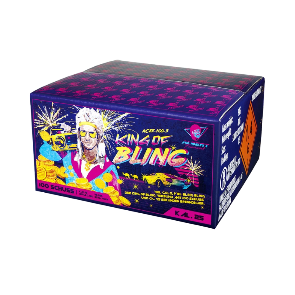 King of Bling van Albert Feuerwerk is een compound met 100 25mm-kogels en een vuurtijd van ongeveer 45 seconden, met de volgende effecten: