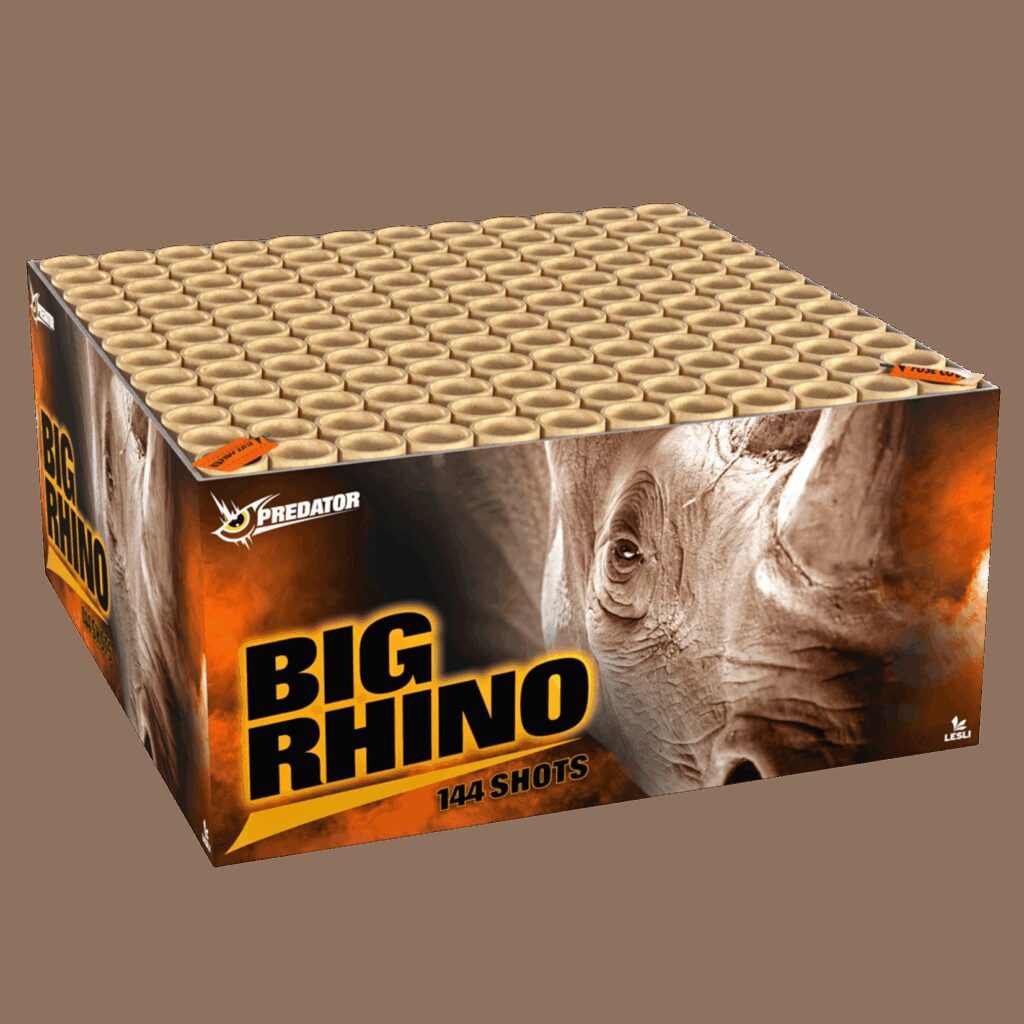 n nIedereen op deze compound is dik! Groot etiket! Sterke effecten! Grote salvo’s! Gevulde avondlucht en dikke finale! n n Predator Vuurwerk Big Rhino 144 shots Goedkoop vuurwerk kopen bij Vuurwerkwinkel Ijburg